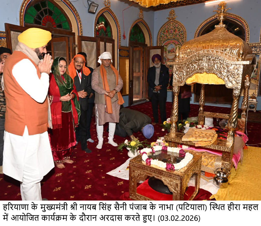 चंडीगढ़, 3 फरवरी – हरियाणा के मुख्यमंत्री श्री नायब सिंह सैनी मंगलवार को पंजाब के नाभा स्थित हीरा महल पहुंचे। यहां पर उन्होंने नाभा शाही परिवार के कुंवर अभ्युदय प्रताप सिंह की दस्तारबंदी के लिए उनके परिवार को बधाई दी। इस अवसर पर उन्होंने यहां पर गुरु ग्रंथ साहिब के समक्ष माथा भी टेका और अरदास की।