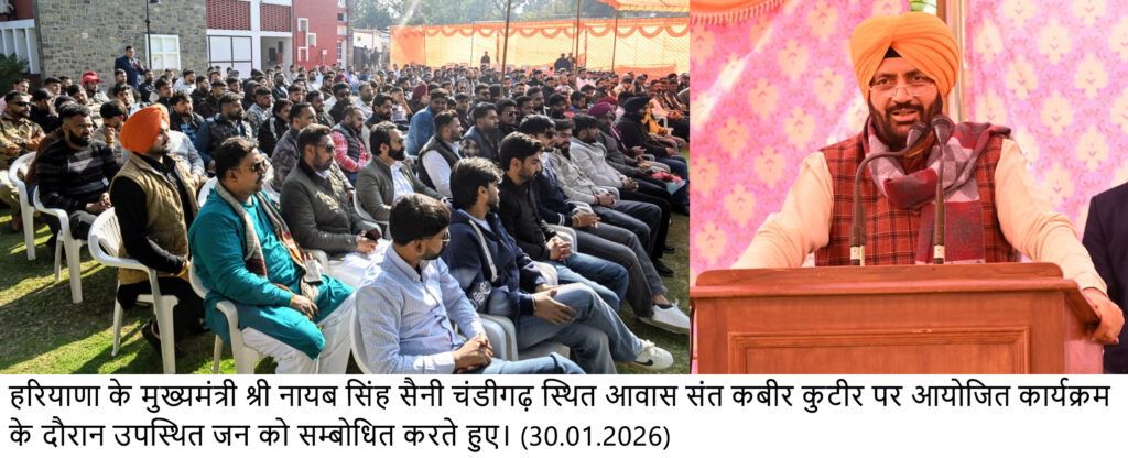 चंडीगढ़, 30 जनवरी — हरियाणा के मुख्यमंत्री श्री नायब सिंह सैनी ने शुक्रवार को उनके आवास संत कबीर कुटीर पर आए पंजाब के युवाओं से संवाद करते हुए शासन, नीति और रोजगार से जुड़े अवसरों पर सार्थक चर्चा की। उन्होंने सुशासन और मेरिट आधारित मॉडल को विकास का आधार बताते हुए पारदर्शी रोजगार नीति पर जोर दिया, ताकि योग्य युवाओं को निष्पक्ष अवसर मिल सकें। मुख्यमंत्री ने कौशल विकास को भविष्य की जरूरत बताते हुए कहा कि प्रशिक्षण, नवाचार और उद्यमिता को बढ़ावा देकर युवा शक्ति को आत्मनिर्भर बनाया जा सकता है।