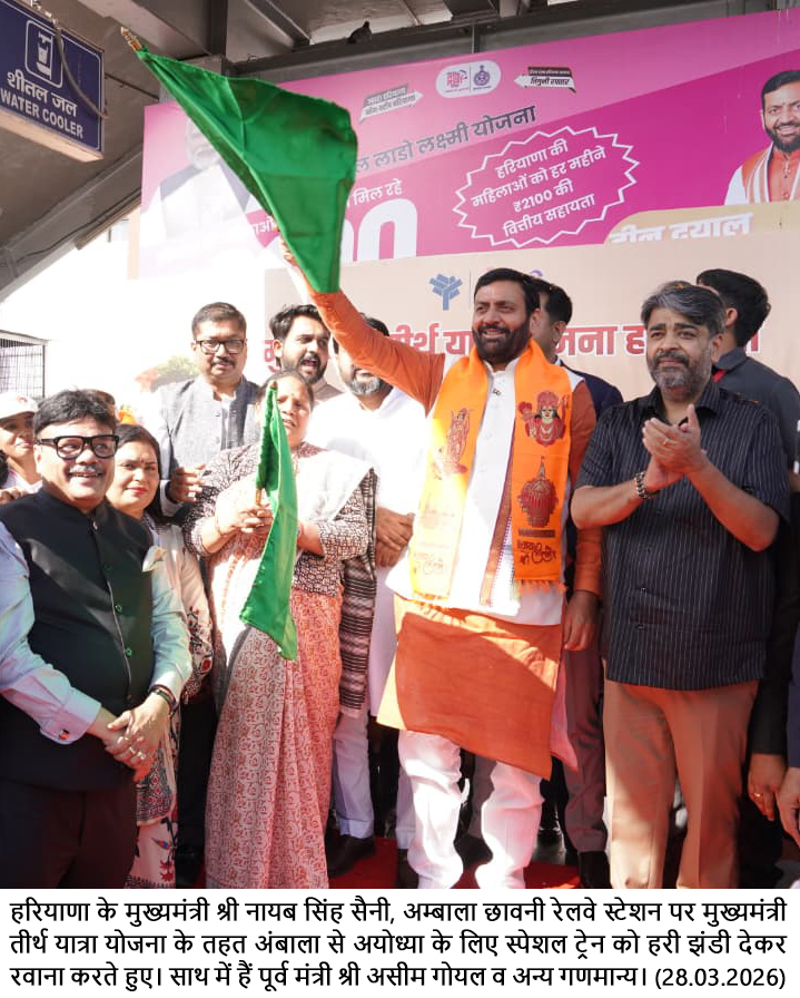 ਚੰਡੀਗੜ੍ਹ, 28 ਮਾਰਚ – ਹਰਿਆਣਾ ਦੇ ਮੁੱਖ ਮੰਤਰੀ ਸ੍ਰੀ ਨਾਇਬ ਸਿੰਘ ਸੈਣੀ ਨੇ ਅੱਜ ਅੰਬਾਲਾ ਤੋਂ ਅਯੋਧਿਆ ਲਈ ਤੀਰਥ ਯਾਤਰੀਆਂ ਦੀ ਵਿਸ਼ੇਸ਼ ਟ੍ਰੇਨ ਨੂੰ ਹਰੀ ਝੰਡੀ ਦਿਖਾ ਕੇ ਰਵਾਨਾ ਕੀਤਾ। ਅਗਲੇ ਮਹੀਨੇ ਅਪ੍ਰੈਲ ਦੇ ਆਖਰੀ ਹਫ਼ਤੇ ਸ੍ਰੀ ਹਜ਼ੂਰ ਸਾਹਿਬ ਗੁਰਦੁਆਰਾ (ਨੰਦੇੜ, ਮਹਾਰਾਸ਼ਟਰ) ਲਈ ਤੀਰਥ ਯਾਤਰੀਆਂ ਵਾਸਤੇ ਵਿਸ਼ੇਸ਼ ਟ੍ਰੇਨ ਜਾਵੇਗੀ।