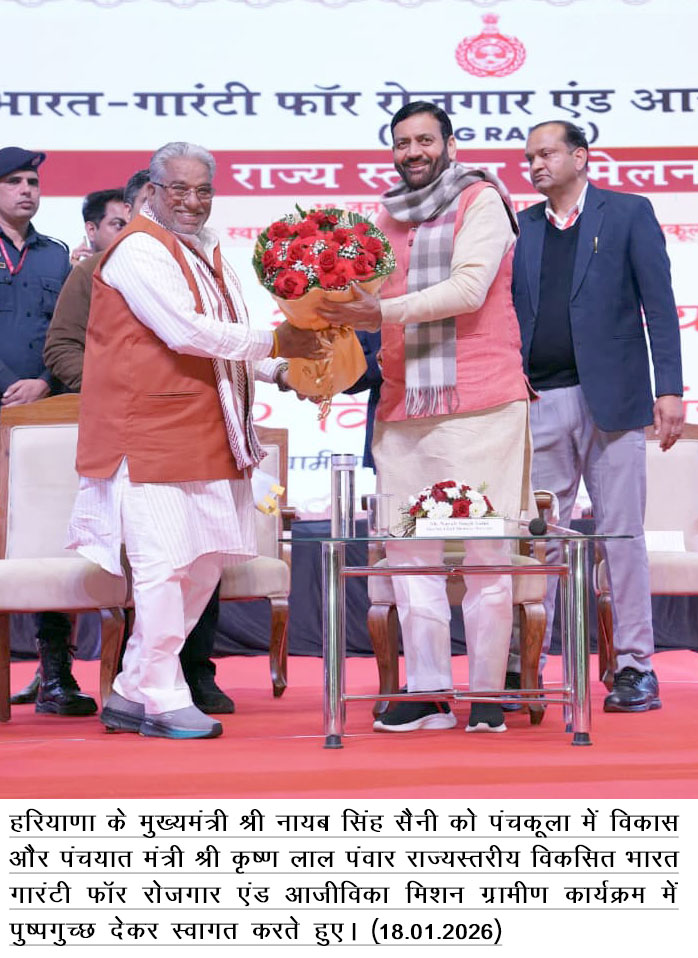 ਸ਼੍ਰੀ ਨਾਇਬ ਸਿੰਘ ਸੈਣੀ ਐਤਵਾਰ ਨੂੰ ਪੰਚਕੂਲਾ ਦੇ ਇੰਦਰਧਨੁਸ਼ ਆਡੀਟੋਰੀਅਮ ਵਿਖੇ ਵਿਕਾਸ ਭਾਰਤ – ਰੁਜ਼ਗਾਰ ਅਤੇ ਆਜੀਵਿਕਾ ਮਿਸ਼ਨ ਗ੍ਰਾਮੀਣ (ਵੀਬੀਜੀ ਰਾਮ ਜੀ) ਰਾਜ ਪੱਧਰੀ ਕਾਨਫਰੰਸ ਵਿੱਚ ਮੌਜੂਦ ਮਜ਼ਦੂਰਾਂ ਨੂੰ ਸੰਬੋਧਨ ਕਰ ਰਹੇ ਸਨ। ਇਸ ਮੌਕੇ ਵਿਕਾਸ ਅਤੇ ਪੰਚਾਇਤ ਮੰਤਰੀ ਕ੍ਰਿਸ਼ਨ ਲਾਲ ਪੰਵਾਰ ਅਤੇ ਸਮਾਜਿਕ ਨਿਆਂ ਅਤੇ ਸਸ਼ਕਤੀਕਰਨ ਮੰਤਰੀ ਕ੍ਰਿਸ਼ਨਾ ਬੇਦੀ ਵੀ ਮੌਜੂਦ ਸਨ।