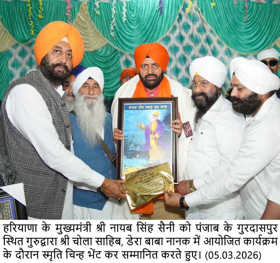 चंडीगढ़, 5 मार्च – हरियाणा के मुख्यमंत्री श्री नायब सिंह सैनी ने बुधवार को पंजाब के गुरदासपुर जिले में स्थित गुरुद्वारा श्री चोला साहिब, डेरा बाबा नानक पहुंचकर माथा टेका और अरदास की। इस दौरान उन्होंने गुरुओं का आशीर्वाद प्राप्त करते हुए प्रदेश तथा देशवासियों की सुख, शांति और समृद्धि की कामना की। उन्होंने गुरु का लंगर में सेवा भी की।