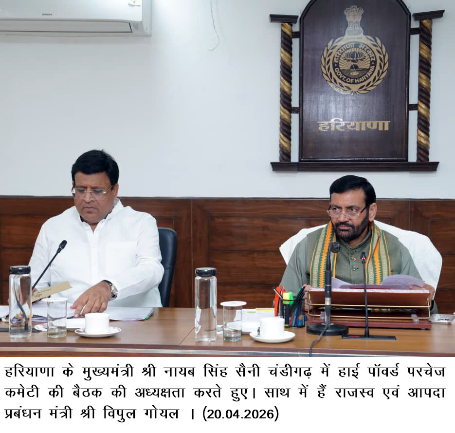 ਚੰਡੀਗੜ੍ਹ, 20 ਅਪ੍ਰੈਲ- ਹਰਿਆਣਾ ਦੇ ਮੁੱਖ ਮੰਤਰੀ ਸ੍ਰੀ ਨਾਇਬ ਸਿੰਘ ਸੈਣੀ ਦੀ ਅਗਵਾਈ ਹੇਠ ਹਾਈ ਪਾਵਰ ਪਰਚੇਜ਼ ਕਮੇਟੀ ਦੀ ਮੀਟਿੰਗ ਹੋਈ। ਮੀਟਿੰਗ ਵਿੱਓ ਤਿੰਨ ਏਜੰਡੇ ਰੱਖੇ ਗਏ ਜਿਸ ਵਿੱਚੋਂ ਦੋ ਏਜੰਡਿਆਂ ਨੂੰ ਅੰਤਮ ਰੂਪ ਦਿੱਤਾ ਗਿਆ।