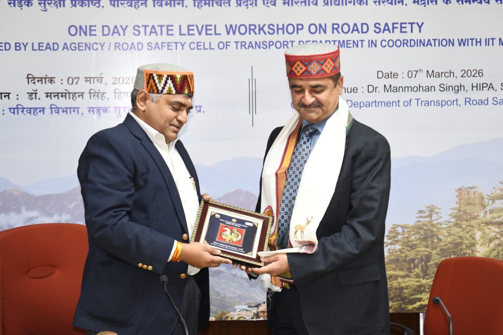 परिवहन विभाग की लीड एजेंसी रोड सेफ्टी सेल द्वारा आईआईटी मद्रास के सेंटर ऑफ एक्सीलेंस फॉर रोड सेफ्टी के सहयोग से आज डॉ. मनमोहन सिंह हिमाचल प्रदेश लोक प्रशासन संस्थान (हिप्पा) में राज्य स्तरीय सड़क सुरक्षा कार्यशाला आयोजित की गई। कार्यक्रम की अध्यक्षता निदेशक परिवहन नीरज कुमार ने की।