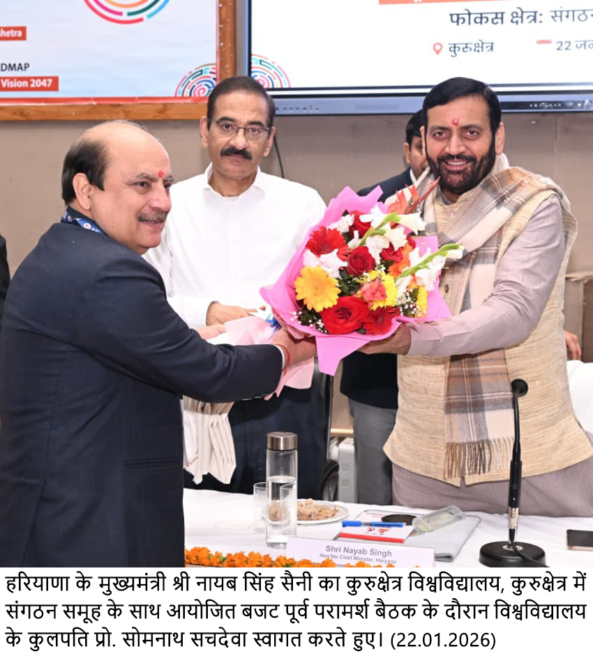 ਚੰਡੀਗੜ੍ਹ, 22 ਜਨਵਰੀ—ਹਰਿਆਣਾ ਦੇ ਮੁੱਖ ਮੰਤਰੀ ਨਾਇਬ ਸਿੰਘ ਸੈਣੀ ਨੇ ਵੀਰਵਾਰ ਨੂੰ ਕੁਰੂਕਸ਼ੇਤਰ ਵਿੱਚ ਵੱਖ-ਵੱਖ ਸੰਗਠਨਾਂ ਨਾਲ ਪ੍ਰੀ-ਬਜਟ ਸਲਾਹ-ਮਸ਼ਵਰਾ ਮੀਟਿੰਗ ਨੂੰ ਸੰਬੋਧਨ ਕੀਤਾ। ਉੱਦਮਤਾ ਰਾਜ ਮੰਤਰੀ ਗੌਰਵ ਗੌਤਮ ਵੀ ਮੌਜੂਦ ਸਨ। ਸਮਾਜ ਦੇ ਵੱਖ-ਵੱਖ ਖੇਤਰਾਂ ਦੀ ਨੁਮਾਇੰਦਗੀ ਕਰਨ ਵਾਲੀਆਂ ਪ੍ਰਮੁੱਖ ਸੰਸਥਾਵਾਂ ਦੇ ਅਧਿਕਾਰੀਆਂ ਨੇ ਮੀਟਿੰਗ ਵਿੱਚ ਸ਼ਿਰਕਤ ਕੀਤੀ। ਭਾਰਤੀ ਕਿਸਾਨ ਸੰਘ, ਭਾਰਤੀ ਮਜ਼ਦੂਰ ਸੰਘ, ਸਵਦੇਸ਼ੀ ਜਾਗਰਣ ਮੰਚ, ਅਖਿਲ ਭਾਰਤੀ ਵਿਦਿਆਰਥੀ ਪ੍ਰੀਸ਼ਦ, ਵਿਦਿਆ ਭਾਰਤੀ, ਵਕੀਲ ਪ੍ਰੀਸ਼ਦ, ਵਿਸ਼ਵ ਹਿੰਦੂ ਪ੍ਰੀਸ਼ਦ, ਕ੍ਰਿਦਾ ਭਾਰਤੀ ਸਮੇਤ ਪ੍ਰਮੁੱਖ ਸੰਗਠਨਾਂ ਦੇ ਅਧਿਕਾਰੀਆਂ ਨੇ ਹਿੱਸਾ ਲਿਆ ਅਤੇ ਆਪਣੇ-ਆਪਣੇ ਖੇਤਰਾਂ ਵਿੱਚ ਸਰਕਾਰ ਨੂੰ ਬਜਟ ਨਾਲ ਸਬੰਧਤ ਮਹੱਤਵਪੂਰਨ ਸੁਝਾਅ ਪੇਸ਼ ਕੀਤੇ।