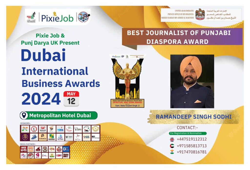 One of the favorite Sikh journalists across the world, Mr. Ramandeep Singh Sodhi, is going to be honored with the ‘Best Journalist Of Punjabi Diaspora Award’ in Dubai on May 12th , 2024, at ‘Dubai Business Award’ function, hosted by Pixie job & Punj Dareya UK.
