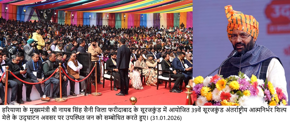 चंडीगढ़, 31 जनवरी — हरियाणा के मुख्यमंत्री श्री नायब सिंह सैनी ने कहा कि 39वां सूरजकुंड अंतर्राष्ट्रीय आत्मनिर्भर शिल्प मेला भारत की समृद्ध सांस्कृतिक विरासत को आत्मनिर्भरता की भावना से जोड़ रहा है। यह मेला ‘वोकल फॉर लोकल’ अभियान को सशक्त आधार प्रदान करते हुए स्थानीय शिल्प, कला और कारीगरों को वैश्विक मंच पर पहचान दिलाने का प्रभावी माध्यम बन रहा है। इस वर्ष ‘लोकल टू ग्लोबल’ और ‘आत्मनिर्भर भारत की पहचान’ थीम पर आधारित यह मेला प्रधानमंत्री श्री नरेन्द्र मोदी के उस विजन को धरातल पर उतारने का प्रयास है, जिसमें हर कारीगर के हुनर को सम्मान और बाजार दोनों मिलें।