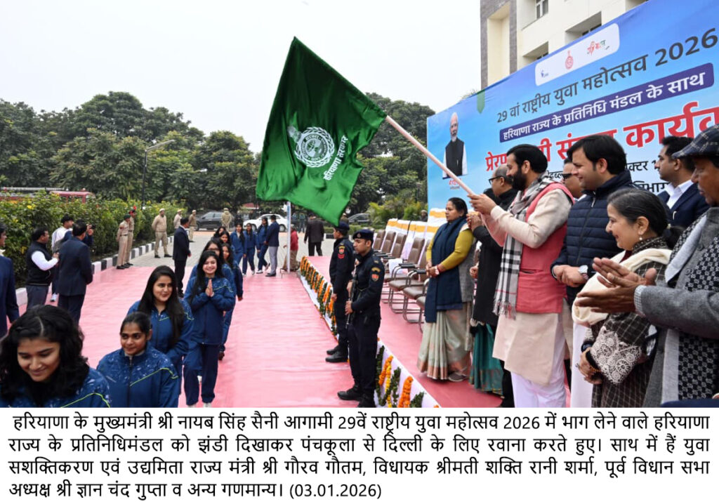 ਇਸ ਤੋਂ ਪਹਿਲਾਂ, ਮੁੱਖ ਮੰਤਰੀ ਨੇ ਰਾਸ਼ਟਰੀ ਯੁਵਾ ਉਤਸਵ-2026 ਵਿੱਚ ਹਿੱਸਾ ਲੈ ਰਹੇ 64 ਨੌਜਵਾਨਾਂ ਨੂੰ ਉਤਸ਼ਾਹਿਤ ਕੀਤਾ, ਉਨ੍ਹਾਂ ਨਾਲ ਇੱਕ ਸਮੂਹ ਫੋਟੋ ਖਿਚਵਾਈ ਅਤੇ ਵਫ਼ਦ ਨੂੰ ਹਰੀ ਝੰਡੀ ਦਿਖਾ ਕੇ ਰਵਾਨਾ ਕੀਤਾ। ਇਹ ਵਫ਼ਦ 9 ਤੋਂ 12 ਜਨਵਰੀ ਤੱਕ ਨਵੀਂ ਦਿੱਲੀ ਦੇ ਭਾਰਤ ਮੰਡਪਮ ਵਿਖੇ ਹੋਣ ਵਾਲੇ ਰਾਸ਼ਟਰੀ ਯੁਵਾ ਉਤਸਵ-2026 ਵਿੱਚ ਹਰਿਆਣਾ ਦੀ ਨੁਮਾਇੰਦਗੀ ਕਰੇਗਾ ਅਤੇ ਵੱਖ-ਵੱਖ ਮੁਕਾਬਲਿਆਂ ਵਿੱਚ ਹਿੱਸਾ ਲਵੇਗਾ। ਇਨ੍ਹਾਂ ਵਿੱਚ ਸਮੂਹ ਡਾਂਸ, ਬਹਿਸ ਮੁਕਾਬਲਾ, ਪੇਂਟਿੰਗ, ਯੰਗ ਲੀਡਰਜ਼ ਡਾਇਲਾਗ, ਹੈਕ ਫਾਰ ਸੋਸ਼ਲ ਕਾਜ਼ ਅਤੇ ਡਿਜ਼ਾਈਨ ਫਾਰ ਏ ਡਿਵੈਲਪਡ ਇੰਡੀਆ ਸ਼ਾਮਲ ਸਨ।