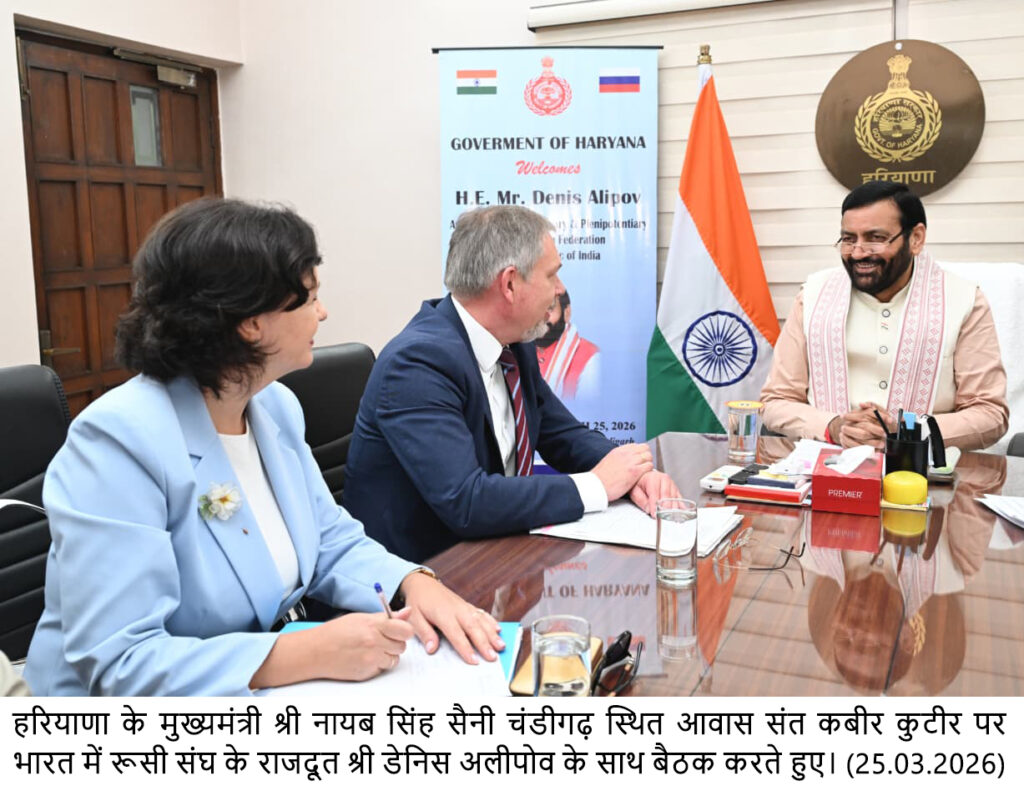 ਮੁੱਖ ਮੰਤਰੀ ਸ਼੍ਰੀ ਨਾਇਬ ਸਿੰਘ ਸੈਣੀ ਬੁੱਧਵਾਰ ਨੂੰ ਹਰਿਆਣਾ ਨਿਵਾਸ ਵਿਖੇ ਯੁਵਾ ਸਸ਼ਕਤੀਕਰਨ ਅਤੇ ਉੱਦਮਤਾ ਵਿਭਾਗ, ਹਰਿਆਣਾ ਦੀਆਂ ਗਤੀਵਿਧੀਆਂ ਅਤੇ ਪ੍ਰਾਪਤੀਆਂ ਦੀ ਸਮੀਖਿਆ ਕਰਨ ਲਈ ਇੱਕ ਮੀਟਿੰਗ ਦੀ ਪ੍ਰਧਾਨਗੀ ਕਰ ਰਹੇ ਸਨ। ਇਸ ਸਮੀਖਿਆ ਮੀਟਿੰਗ ਦੌਰਾਨ, ਵਿਭਾਗ ਦੇ ਮੰਤਰੀ, ਸ਼੍ਰੀ ਗੌਰਵ ਗੌਤਮ ਨੇ ਮੁੱਖ ਮੰਤਰੀ ਦਾ ਗੁਲਦਸਤਾ ਭੇਂਟ ਕਰਕੇ ਸਵਾਗਤ ਕੀਤਾ।