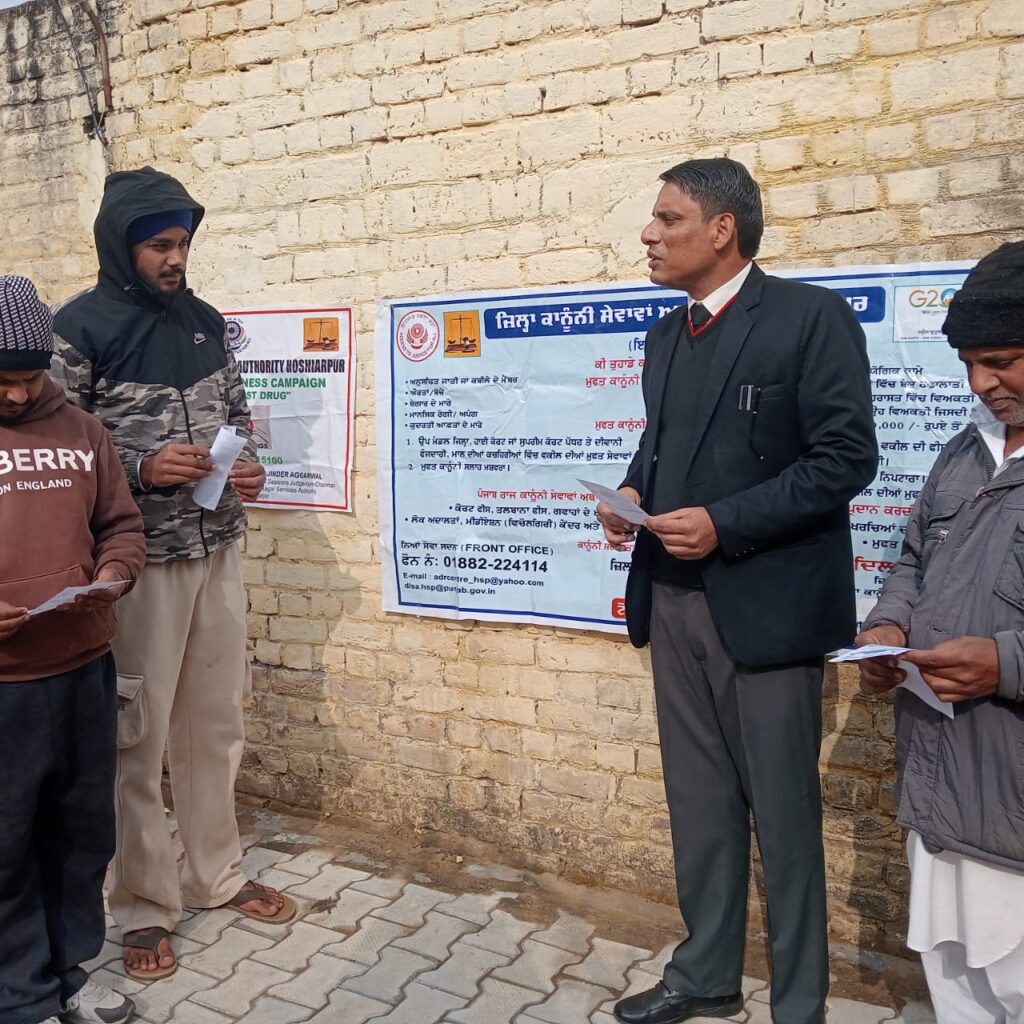ਹੁਸ਼ਿਆਰਪੁਰ, 3 ਜਨਵਰੀ:- ਜ਼ਿਲ੍ਹਾ ਕਾਨੂੰਨੀ ਸੇਵਾਵਾਂ ਅਥਾਰਟੀ ਹੁਸ਼ਿਆਰਪੁਰ ਵੱਲੋਂ ਪੰਜਾਬ ਰਾਜ ਕਾਨੂੰਨੀ ਸੇਵਾਵਾਂ ਅਥਾਰਟੀ ਐਸ.ਏ.ਐਸ ਨਗਰ ਦੇ ਦਿਸ਼ਾ-ਨਿਰਦੇਸ਼ਾਂ ਅਤੇ ਜ਼ਿਲ੍ਹਾ ਤੇ ਸੈਸ਼ਨ ਜੱਜ ਰਜਿੰਦਰ ਅਗਰਵਾਲ ਦੇ ਹੁਕਮਾਂ ਦੀ ਪਾਲਣਾ ਕਰਦੇ ਹੋਏ ਸਕੱਤਰ, ਜ਼ਿਲ੍ਹਾ ਕਾਨੂੰਨੀ ਸੇਵਾਵਾਂ ਅਥਾਰਟੀ ਨੀਰਜ ਗੋਇਲ ਵੱਲੋਂ ਜ਼ਿਲ੍ਹਾ ਹੁਸ਼ਿਆਰਪੁਰ ਅਤੇ ਸਬ-ਡਵੀਜ਼ਨਾਂ ਦੇ ਵੱਖ-ਵੱਖ ਪਿੰਡਾਂ ਵਿੱਚ ਜਾਗਰੂਕਤਾ ਮੁਹਿੰਮ ਚਲਾਈ ਜਾ ਰਹੀ ਹੈ।